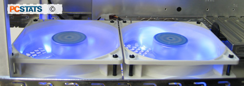 mind, but the idea works with any other watercooling kit as well. Just above the PCI brackets are two 120mm exhaust fans (both are blue LED illuminated) which are held in place with vibration absorbing rubber posts. The idea is that a single 120mm sized radiator can be installed just behind these fans, and the exhaust airflow from the case harnessed for cooling without adding any additional noise.