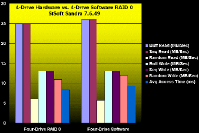 Regardless, it seems that this controller's RAID 0 functionality is mostly just good for write speeds, as in many cases its read speeds are lower than that of a single drive. Certainly the performance is nowhere near what I expected from a hardware RAID 0 array. For comparison, I created a four-drive software RAID 0 array as a comparison. Instead of creating the array with the controller, I simply booted Windows 2000 Professional with all the drives unused by the RAID controller. Windows detected them and I simply created a software array through the Disk Management applet. Here's how it performed: